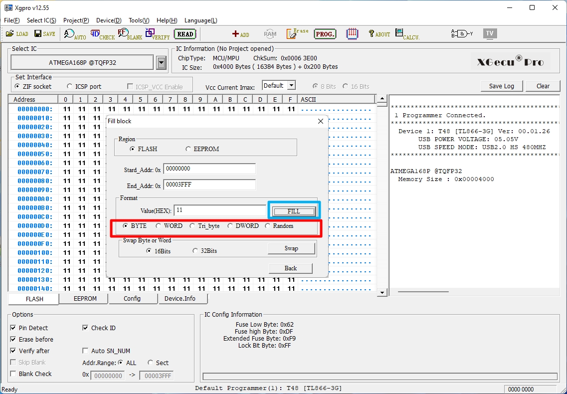 An "The buffer is no data loaded" warning is issued. Although the buffer is not empty. It's full. Can be filled in via menu "Fill Block" or entered manually.