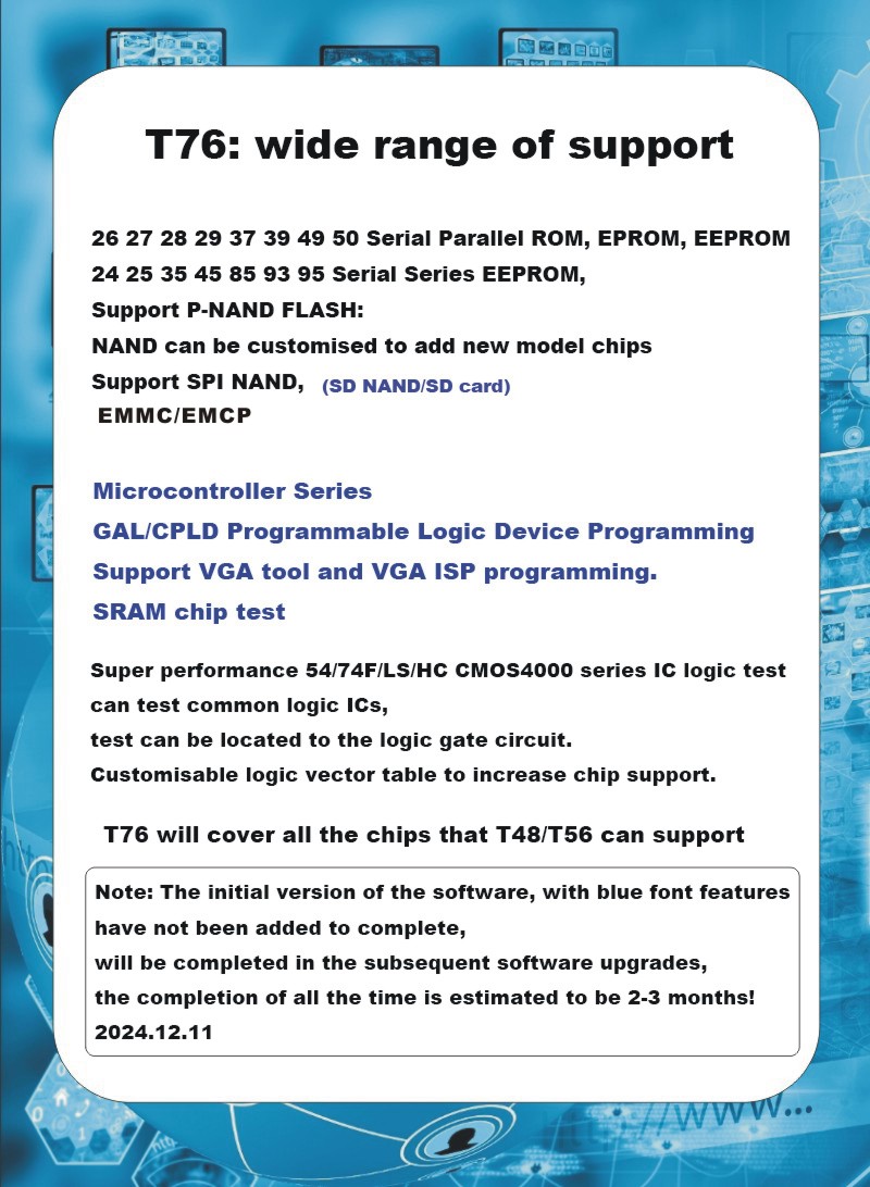 | V13.03A for T76- Software and IC support List are here xgecu. (Newer 'A' setup file seen for download, maybe corrected any install error) 1. The number of supported chips has been increased to 39,009, with over 250 chips added. This primarily includes support for Micron's MT35XUxxx and MT35XLxxx series Octal chips. Read speeds reach 60+ MB/s. 2. Automatic serial number increment for T76 has been implemented. 3. Support for multi-machine programming has been implemented (up to four programmers can be connected to one computer simultaneously). 4. The software interface now automatically adapts to high-DPI monitors. 5. Multiple software optimizations have been made to ensure greater stability. Firmware updated to version 1.13 from 1.11