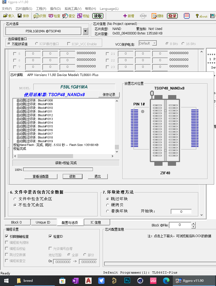 当第6项:选择“不包含冗余区”;第7项:选择“跳过坏块”,读取到的是:冗余区的数据和坏块的标记数据——除了FF就是坏块标记,128MB的芯片,读出的数据是4MB大小,是选反了吗?还是我操作错误。