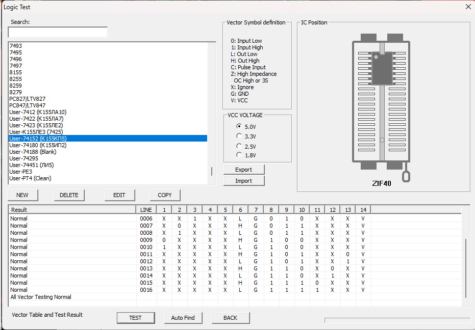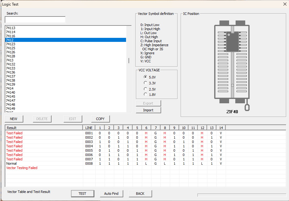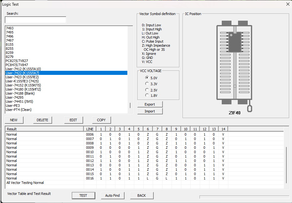 I want to share my logic tests, which are not in the programmer or are, but with errors..7412 (Russian К155ЛА10) - bad test in programator, instead of (High) - it is necessary Z (open collector)