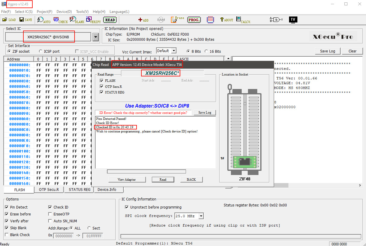 i try to unchek ID . i read dump but its crupted .... there is problem . i try w25r256 work perfect