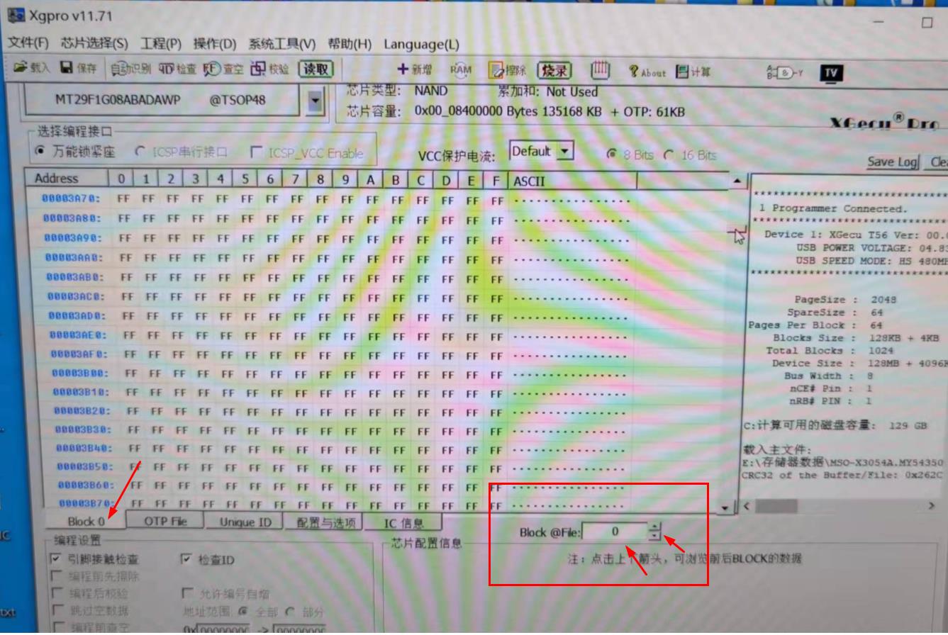 2. NAND芯片,屏幕显示是第n个块的数据,默认是第0块数据,有可能是空的,右下Block@file 处可用上下箭头,进行块切换查看数据,也可以直接输入查看的数据块号,这个芯片总其有1024个块(0-1023)