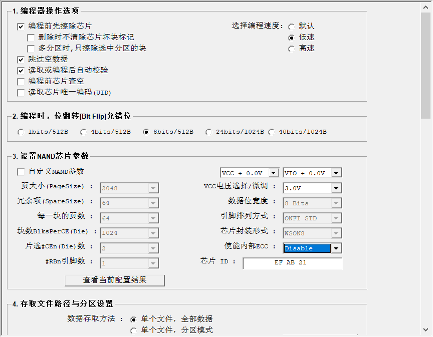 使用DS35Q2GA(ECC_DIS)@WSON8的数据写入W25M02GV,在校验时候就出错,降低电压,提高电压,改低速,换编程器固件这些都试过,故障依旧。
