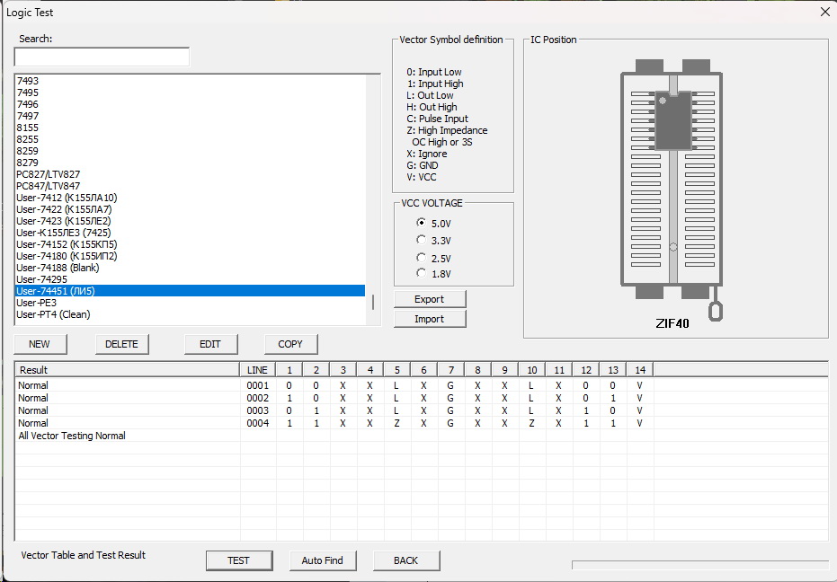 I want to share my logic tests, which are not in the programmer or are, but with errors..7412 (Russian К155ЛА10) - bad test in programator, instead of (High) - it is necessary Z (open collector)