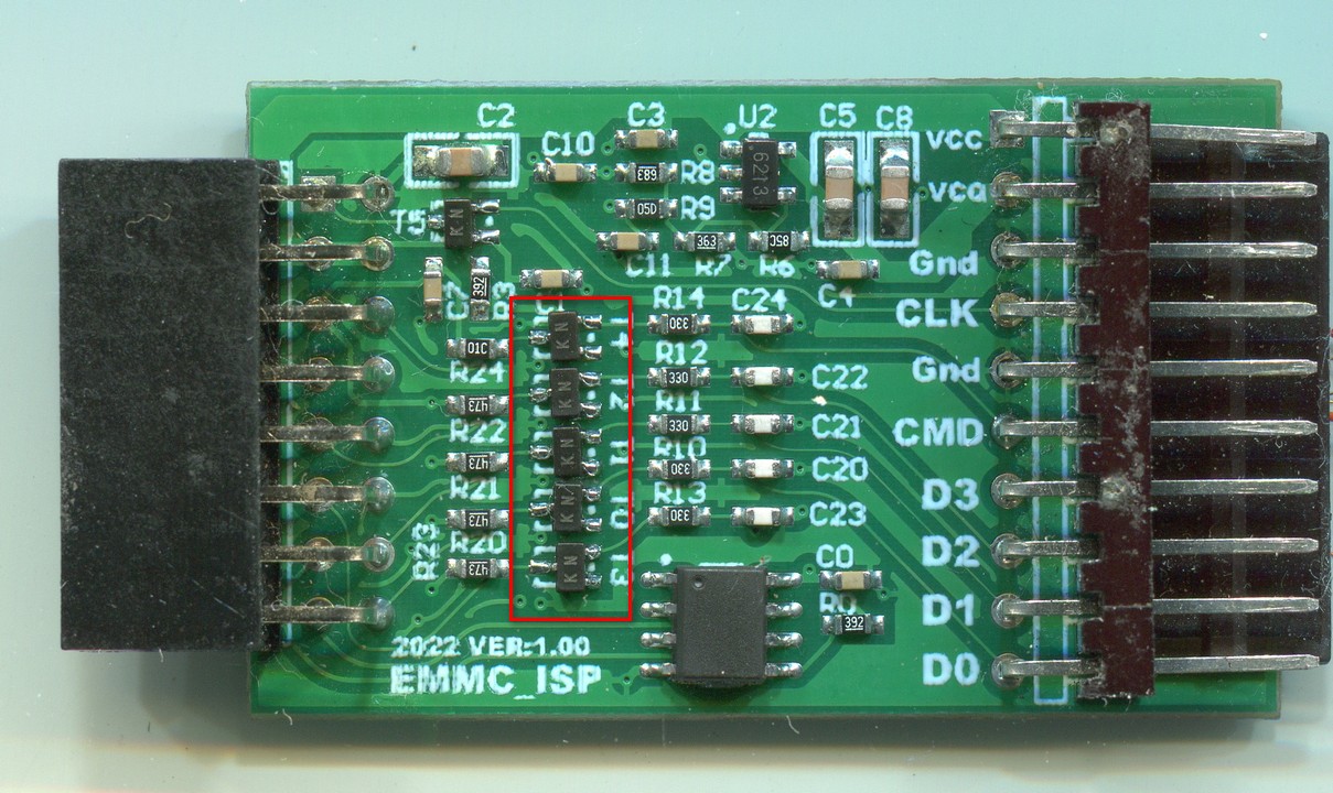 Hi! I already used this adapter, it was worked, but now it doesn't work correctly. The lines to the device's CPU are cut off and do not interfere, but the connection to the EMMC is unstable. Using an oscilloscope, I see a distorted signal on the lines. Is it possible to find out what transistors are installed in the adapter? This is a transistor in a SOT-323 package marked K N. Is this 2sk3018? Identical transistors are checked differently with a multimeter.