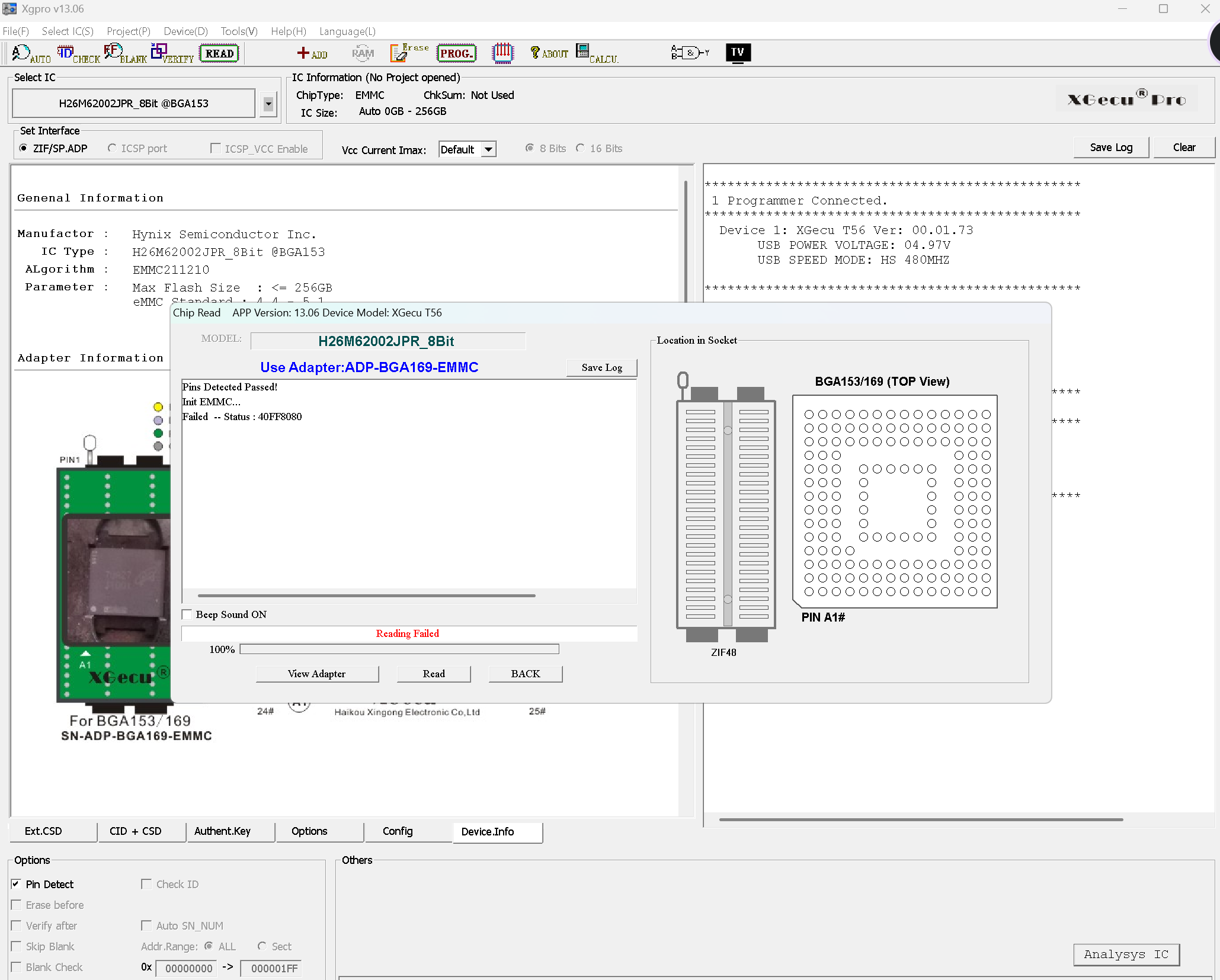 I am using an external 5v power supply, also I tried auto emmc (1 bit, 4bits, 8 bits) with same error, also I put a H26M52103FMR and reads and analyzed OK, so I know the device is OK. Adapter is XGecu BGA153 BGA169 (ADP BGA169 EMMC-2). Have anyone been able to read the H26M62002JPR with the T56?