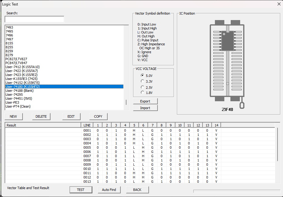 I want to share my logic tests, which are not in the programmer or are, but with errors..7412 (Russian К155ЛА10) - bad test in programator, instead of (High) - it is necessary Z (open collector)