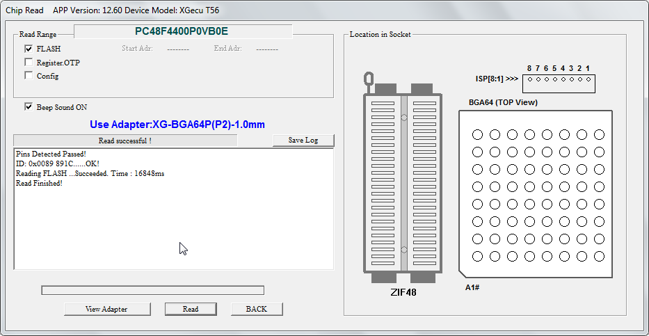Unfortunately, I'm unable to read and verify PC48F4400P0VB0E (BGA64) with adapter XG-BGA64P2-1.0mm