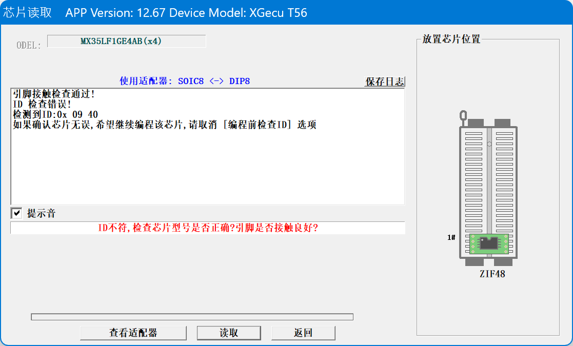 請問在讀取晶片MX35LF1GE4AB的時候,都會出現ID不符的錯誤,取消檢查ID後可正常讀取,但是內容都為0,請問是什麼原因?