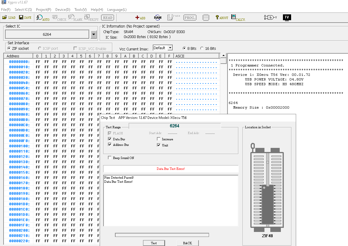 I have a T56 and I can't test Static ram model 6264 or W2465. I tested 10 W2465 chips and 10 HM6264 chips. All new and original chips. The same error on all tested chips - "Data bus test error". Has anyone experienced this?