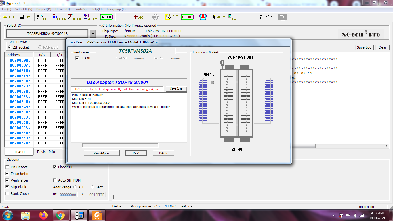Recently, i need to copy a nor flash TC58FVM5B2A and got ID error. The correct ID on datasheet of manufacturer is 0098 0055 as tl866II read when push ID check button, but when push read button it say that require ID 0098 00CA. The flash come from a fully working device. When i untick check ID then read, it read all FF. Please check for that issue!  |
