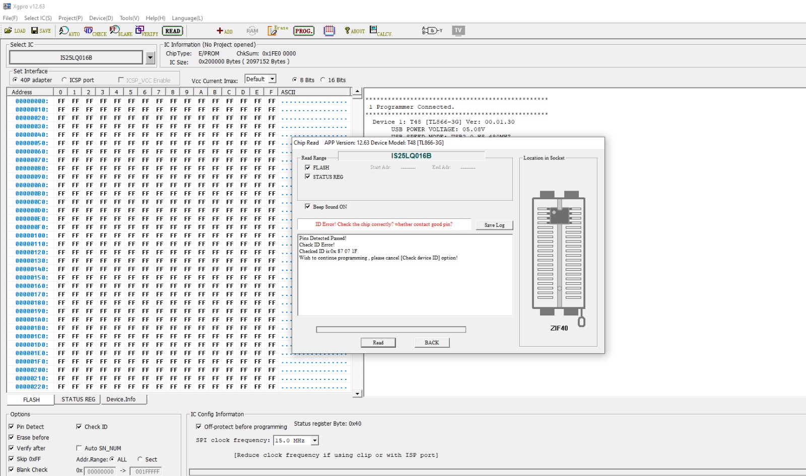 Hola este es el problema del chip Bios cuando el programador intenta leer, también aparece el id qu ...