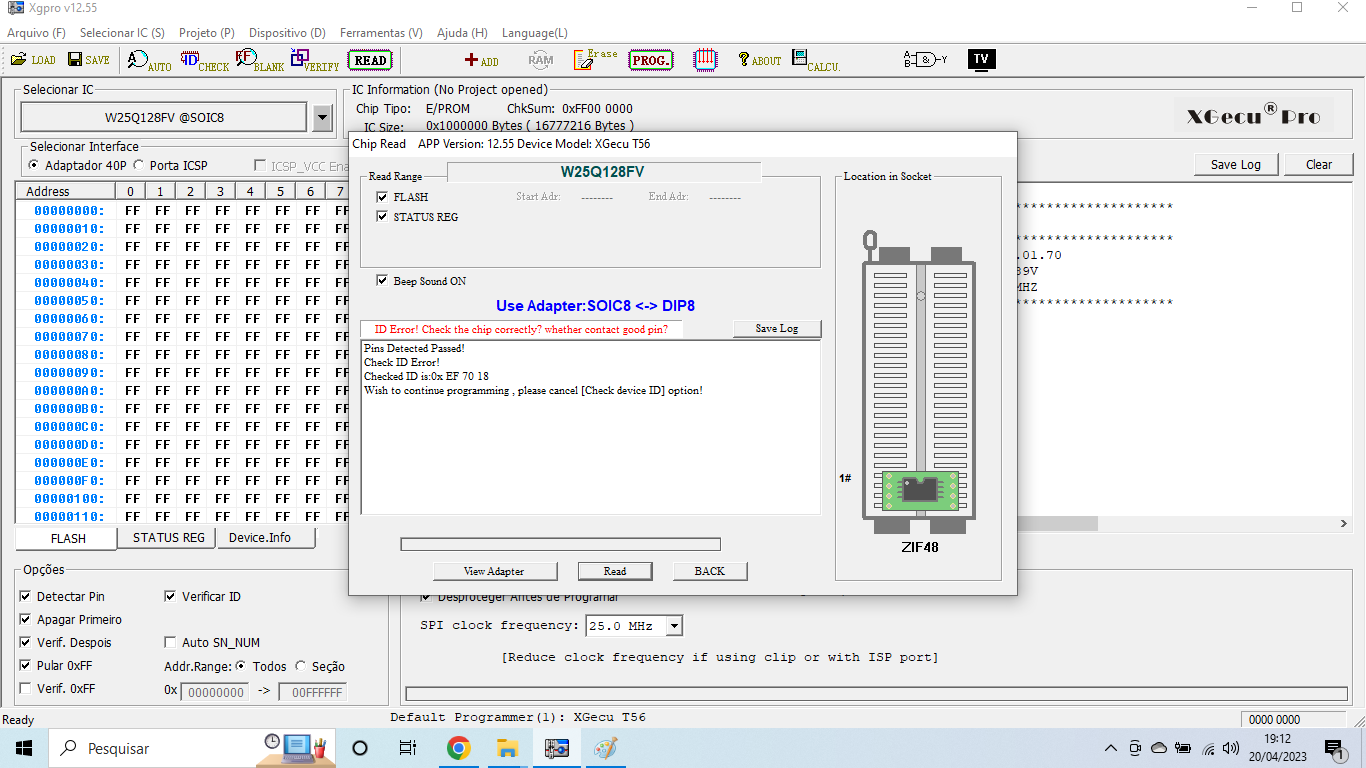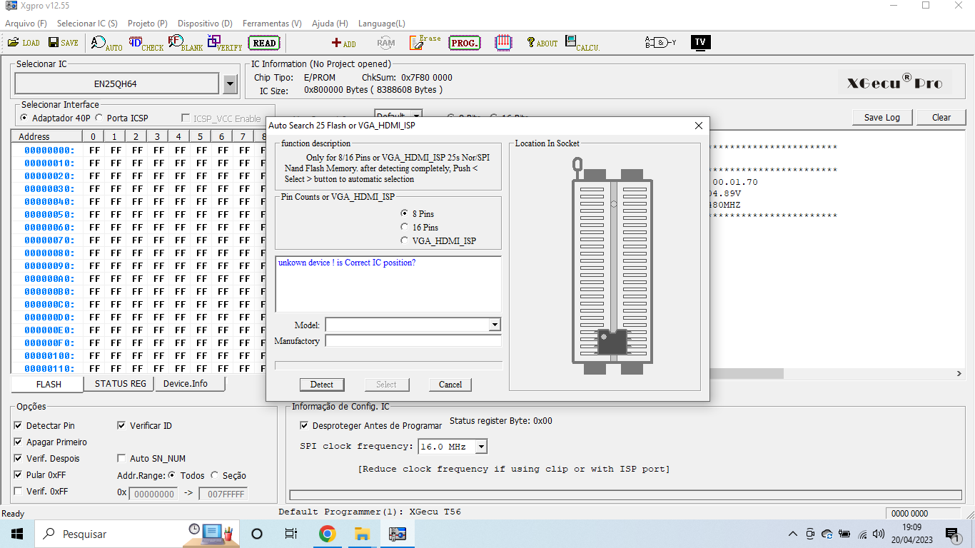 Nao identifica e nao le ou escreve. Tenho T56, e TL866 plus nao indentifica e nem ler. Ja com outros ... marck3