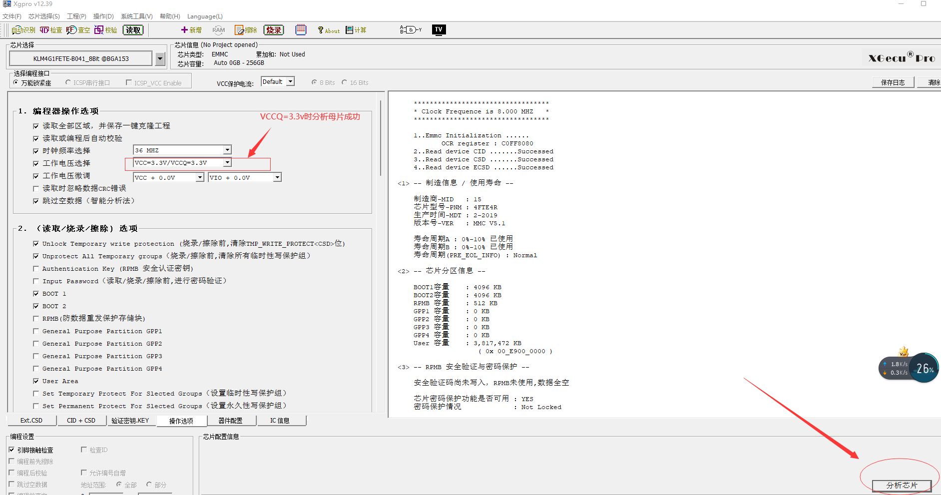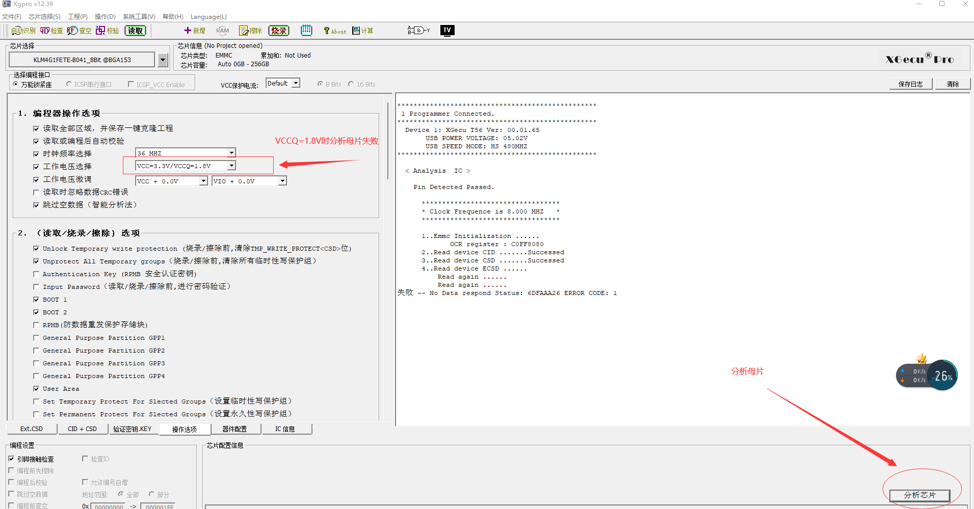 1.分析母片的时候除了选择对应型号,也需要手动设置工作电压吗?有一片BGA153的三星EMMC,选择对应型号后自动设置的VCCQ电压是1.8v,分析母片的时候失败,手动选择VCCQ电压为3.3v时分析母片成功