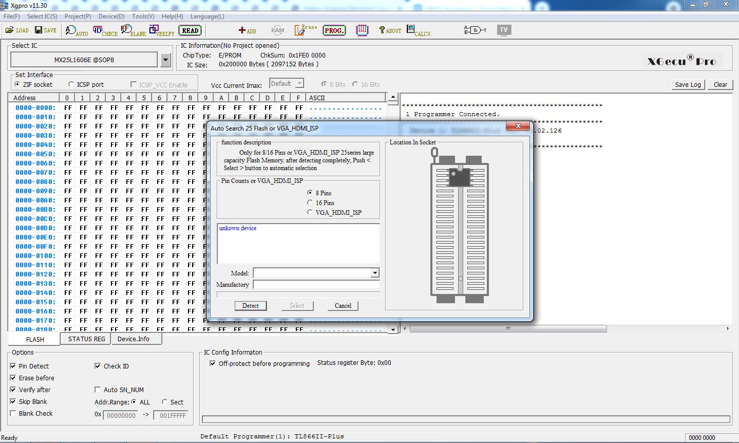 Hi. I have programmer TL866II Plus. Now i want to program MX25L1606 chip, but when i choose «25 Flash detect», program wrote massage «unknown device». If i select type of chip manually, and press read chip, program write «id error». I tried to program another chip MX25L1606, but have this error too.
