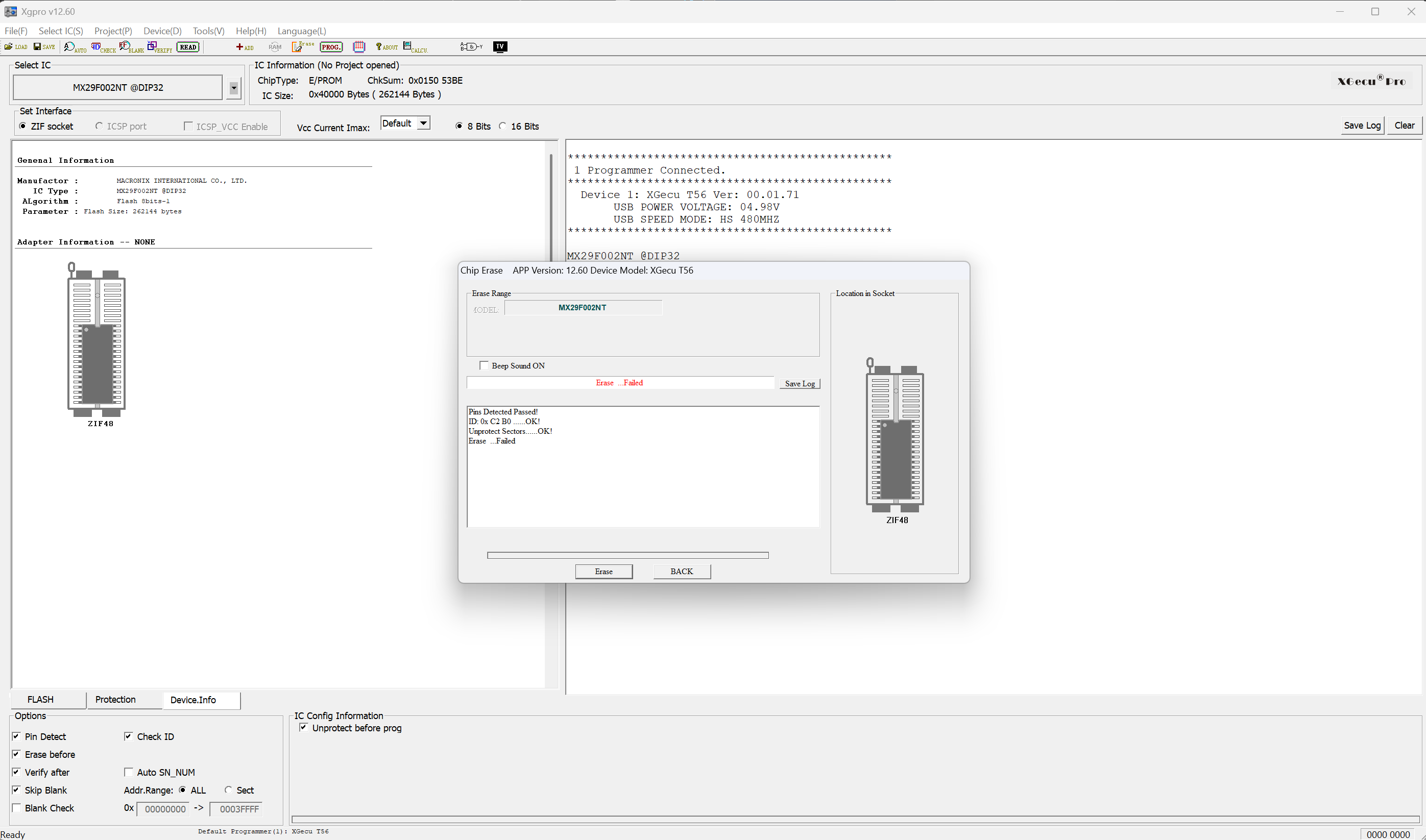 Dear Admin, Revisiting old stock chips and , so far , only one IC didn't work MX29F002NTPC-12 32PDIP version.