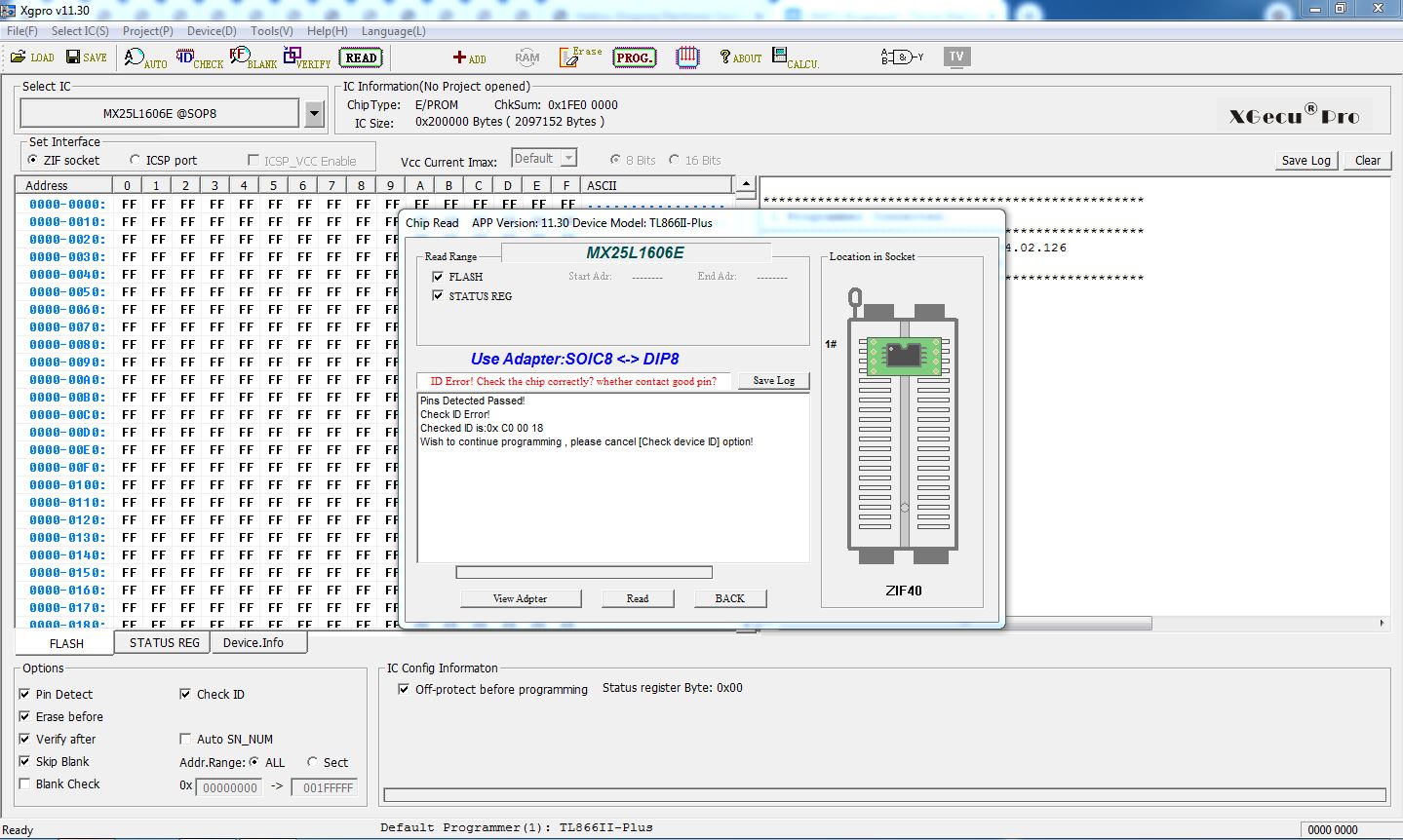 Hi. I have programmer TL866II Plus. Now i want to program MX25L1606 chip, but when i choose «25 Flash detect», program wrote massage «unknown device». If i select type of chip manually, and press read chip, program write «id error». I tried to program another chip MX25L1606, but have this error too.
