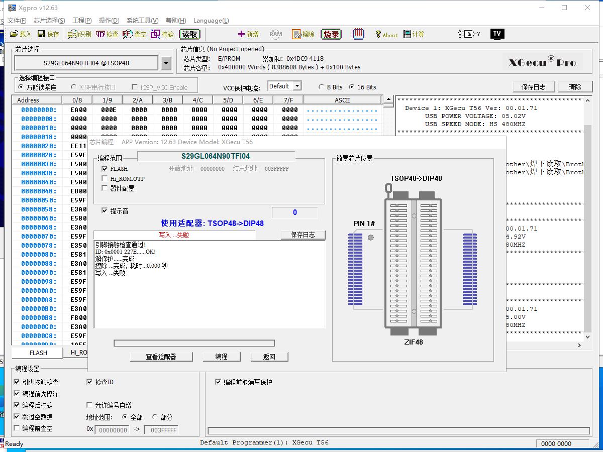 S29GL064N90TFI04@TSOP48 芯片可以读,不能写,提示错误,更换过3~4个类似的芯片(如MX29GL640EBTI)也是一样,编程器读写其他的TOSP48芯片正常(如29F1G08ABAEA)