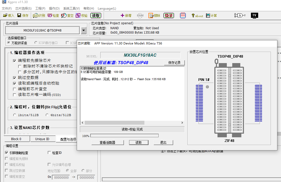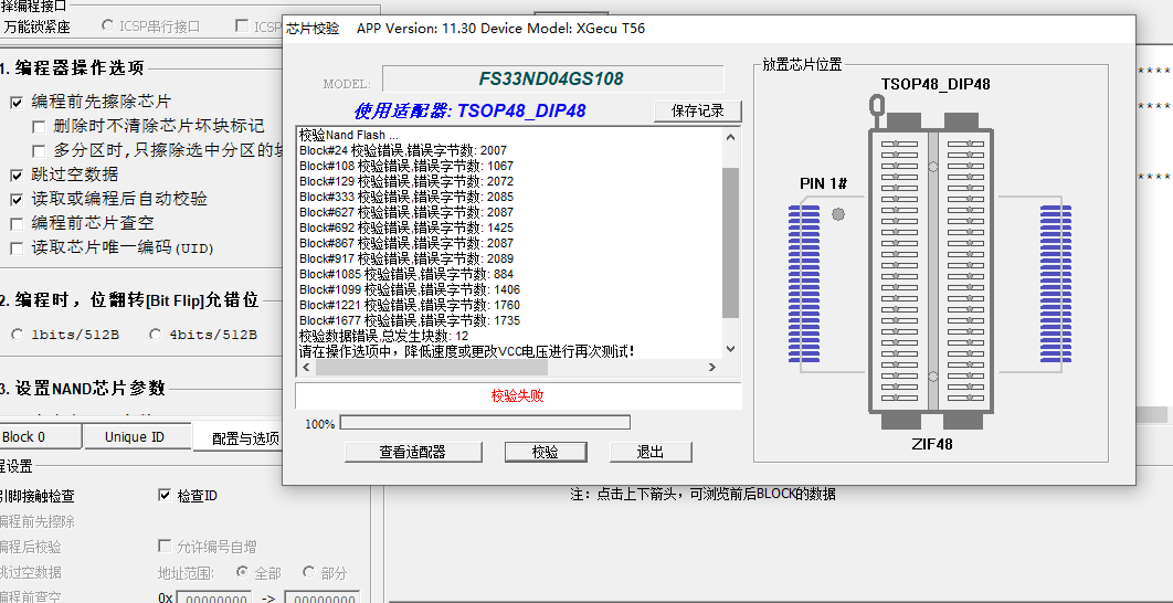对于编程器,现在适配器难达到要求。我测试时,试了多个座子,TSOP56-》DIP56的那个基本上每次能通过,其他的总是会出错。