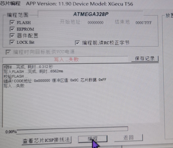 通过ICSP引线,能够顺利读取源芯片 atmega328P的数据,并产生.hex文件,但在烧录时出现如附件中显示的错误:另外,只有将ID检查不勾才能继续烧录,否则说ID错误,但可以肯定的是芯片是atmega328P没错。请问这是什么问题?