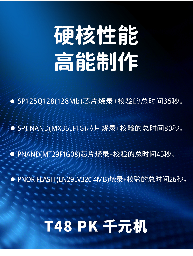 T48与T56相同,EMMC功能完整,功能上PK任一台EMMC编程器,是最完整功能的EMMC编程器之一。快速、稳定、可靠。并可以作工厂小批量生产使用。