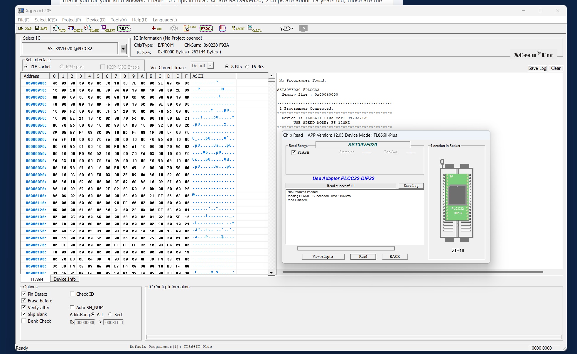 I have successfully read several PLCC32 (SST39VF020) and now try to program the .bin files to brand new and empty