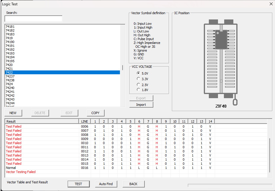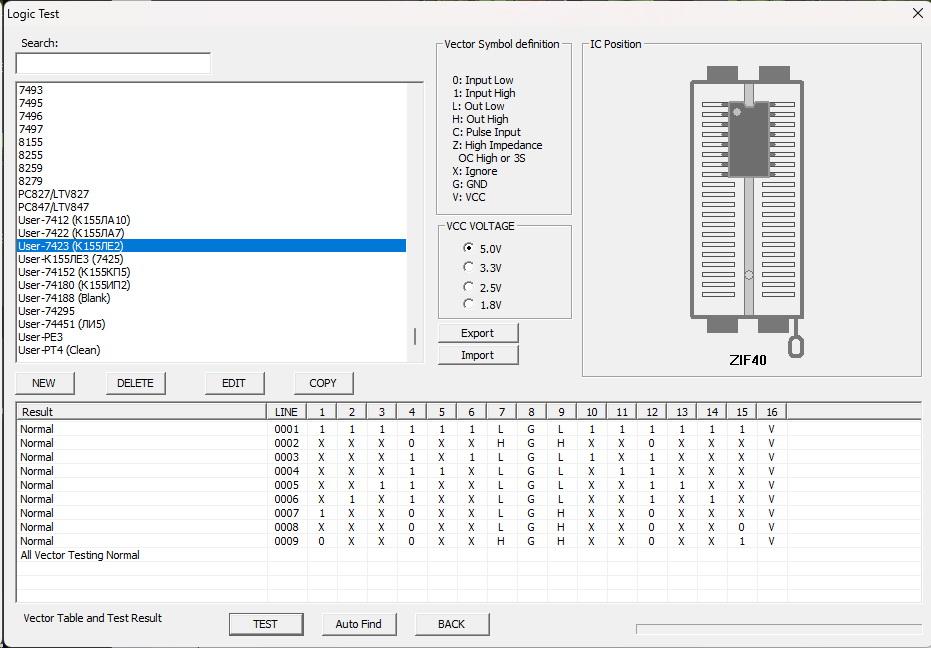 I want to share my logic tests, which are not in the programmer or are, but with errors..7412 (Russian К155ЛА10) - bad test in programator, instead of (High) - it is necessary Z (open collector)