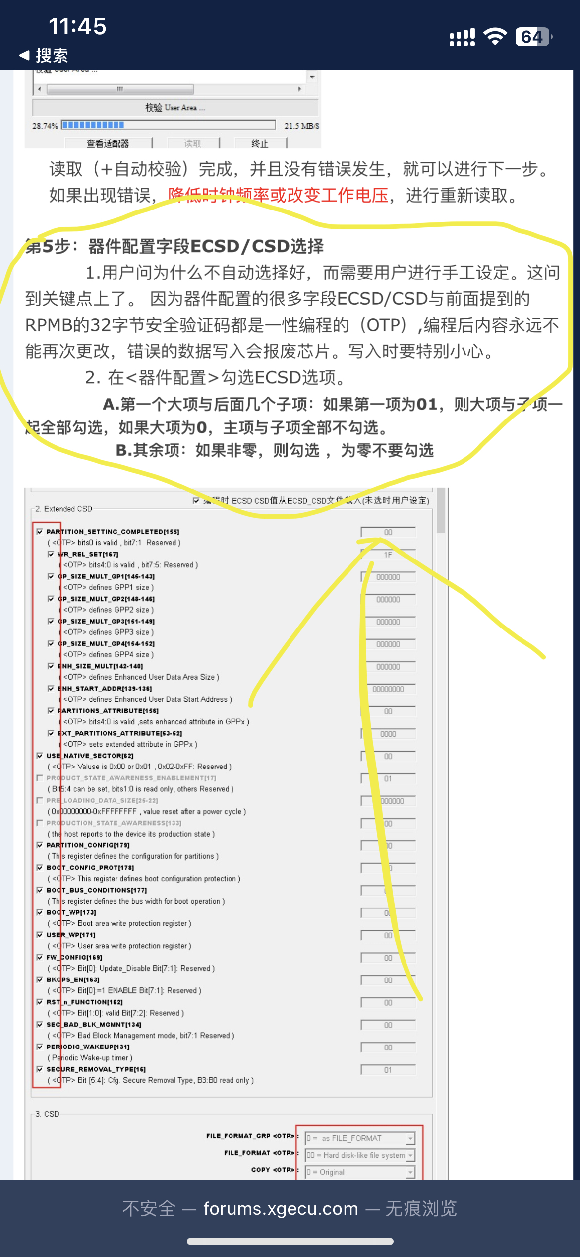 看之前帖子里面讲过ECSD/csd都是一次性编程。是不是旧芯片中含有ECSD/CSD配置,不管怎么写新的ECSD/CSD配置进去也不会改变原来的配置。一键烧录的时候如果克隆原母片数据到一片新EMMC中时,第一次写入原母片ECSD/CSD到其中是,就固定了这个配置,后面就改不了了?如果是这样的话,那旧的芯片本身就有此项设置,如何格式化EMMC呢?