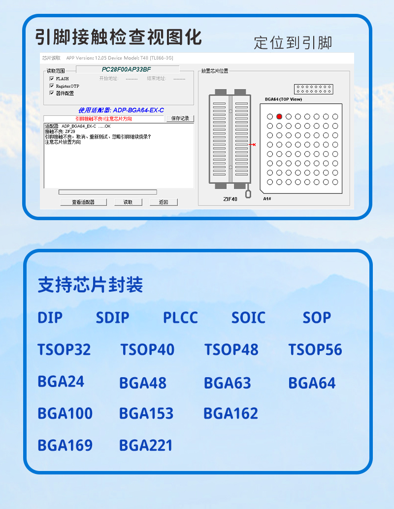 the software --> Device.info tab near the bottom of programmer software window. You may also take a look here adapters for T48 - Shop Cheap adapters for T48 from China adapters for T48 Suppliers at XGECU Official Store on Aliexpress.com