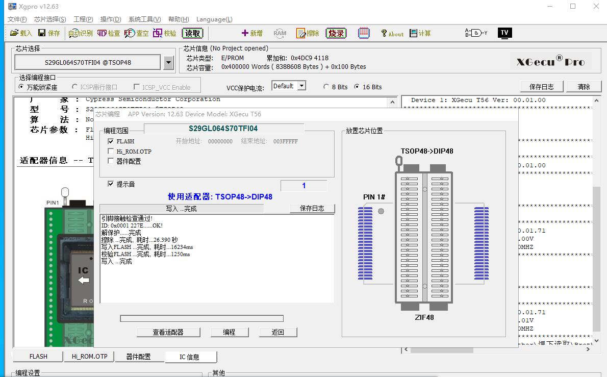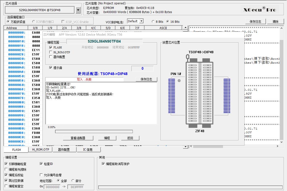 S29GL064N90TFI04@TSOP48 芯片可以读,不能写,提示错误,更换过3~4个类似的芯片(如MX29GL640EBTI)也是一样,编程器读写其他的TOSP48芯片正常(如29F1G08ABAEA)