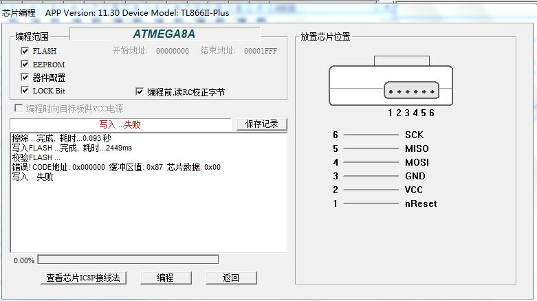 TL866II PLUS针对ATMEGA8A-AU使用ICSP编程的问题
