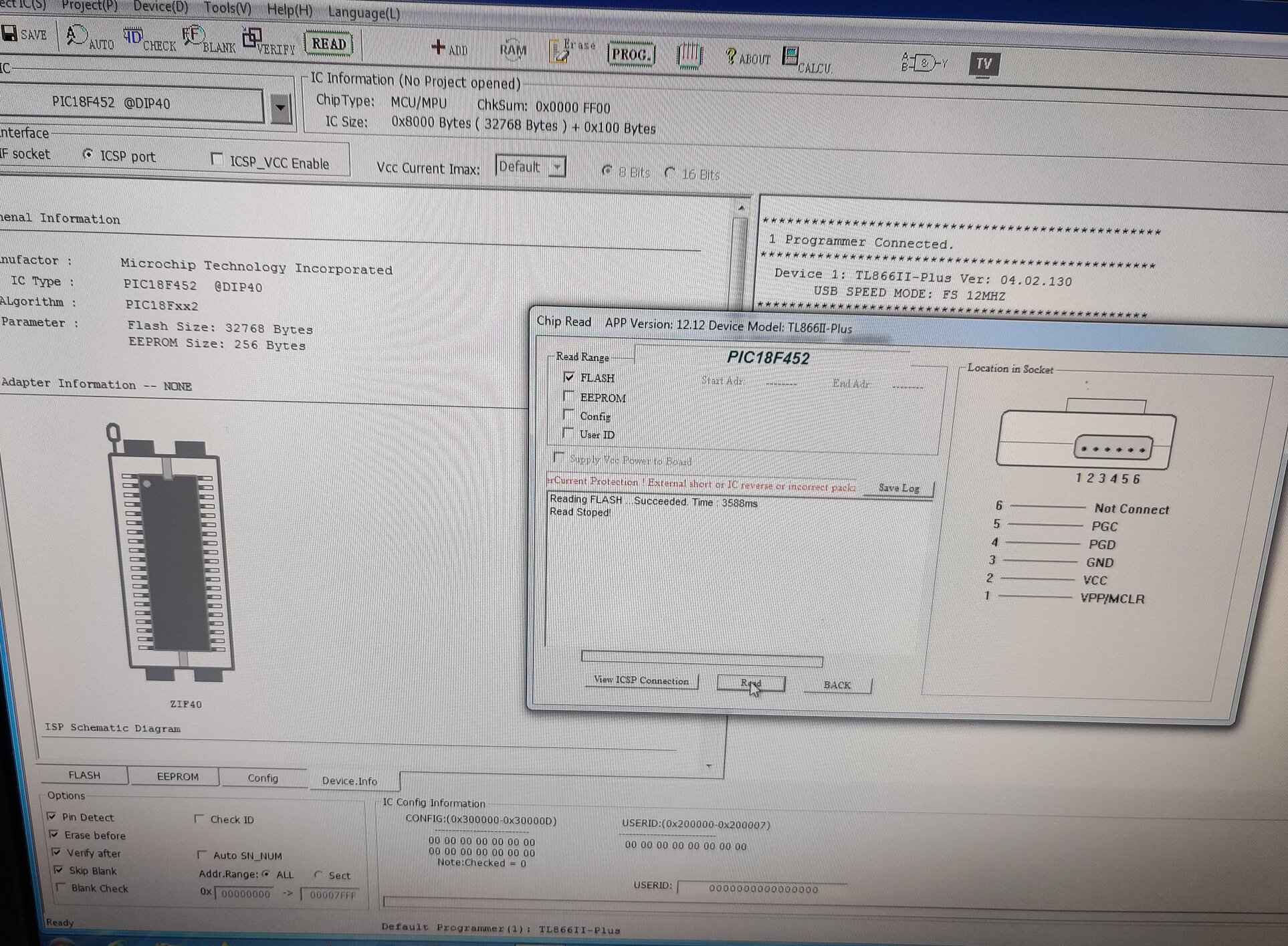 Hi, i buy original TL866II plus with almost all adapters from you. I have problem that i cant read PIC18F452-i/pt.I select microchip pic18f452 (dip40) in program and select ICSP port (ICSP_VCC Enable) and soldered wires to same chip but in TQFP package. And try to read it but it start to read it and when it almost finish reading it give me error: overcurrent protection! external short or IV reversed... Can you please help me how to connect and read that chip please, if i did somening wrong.