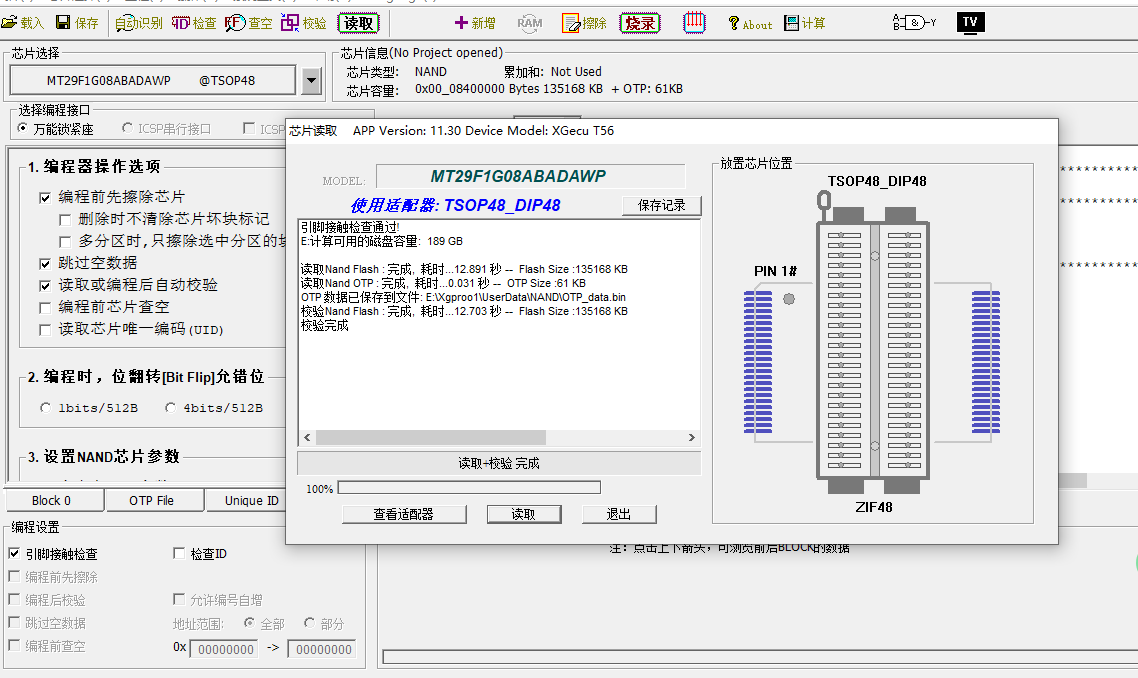 对于编程器,现在适配器难达到要求。我测试时,试了多个座子,TSOP56-》DIP56的那个基本上每次能通过,其他的总是会出错。