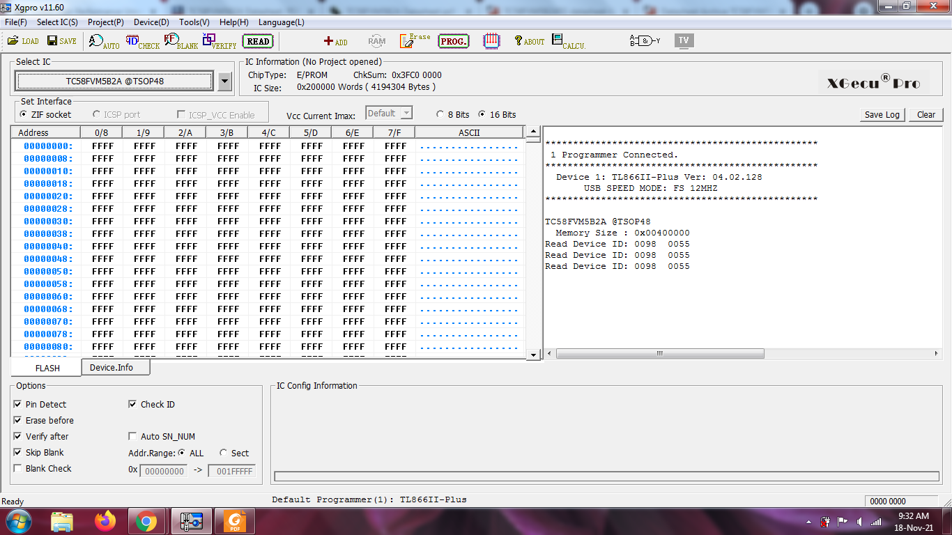 Recently, i need to copy a nor flash TC58FVM5B2A and got ID error. The correct ID on datasheet of manufacturer is 0098 0055 as tl866II read when push ID check button, but when push read button it say that require ID 0098 00CA. The flash come from a fully working device. When i untick check ID then read, it read all FF. Please check for that issue!  |