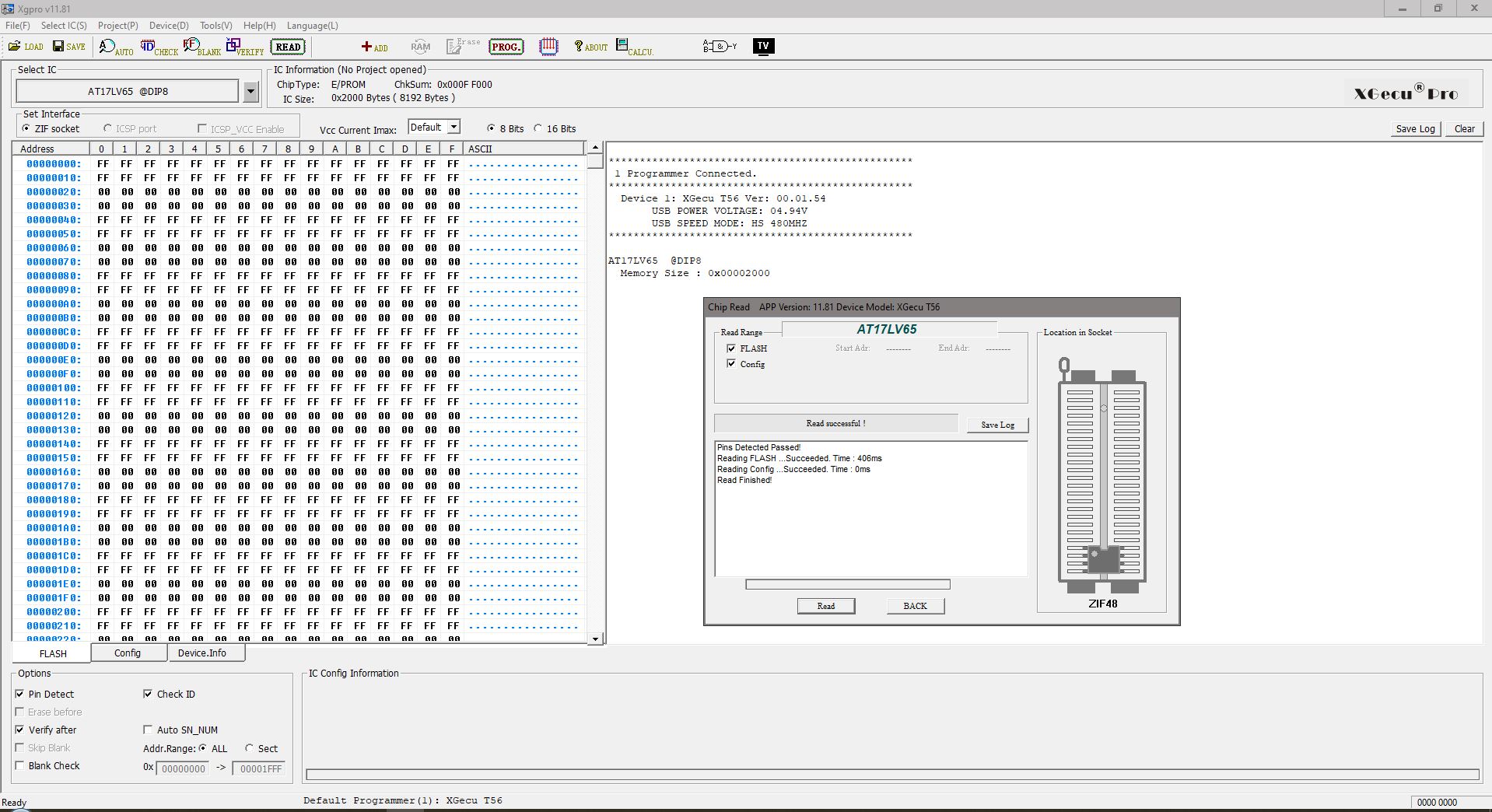 I upgraded from the 866 to the T56 to program AT17LV65 FPGA configuration PROMs, but I think there is a problem with the algorithm in the Xgpro software for it. It will not write properly. If I take a blank device (all FF's) and write all zeros (00) to it it comes up and error and when I read it back every other row still as FFs rather than all 00s. I can select an AT17LV128 and it will write the flash correctly to the smaller device, but then I can't set the configuration. Please help resolve this problem. I've attached a picture